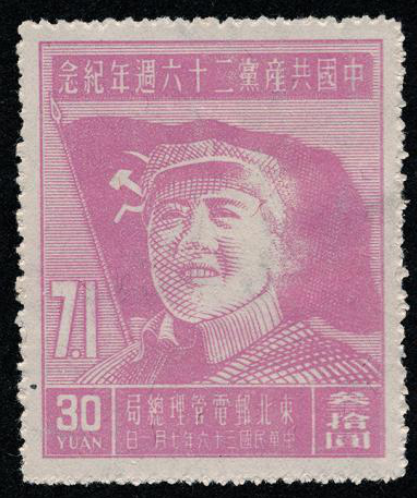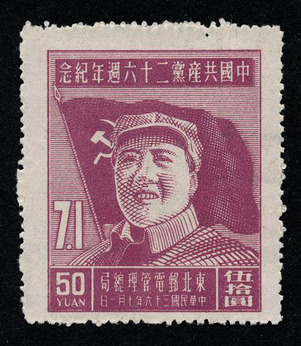 1947年7月1日,東北郵電管理總局發(fā)行《中國(guó)共產(chǎn)黨二十六周年紀(jì)念》郵票,一套4枚。郵票圖案為毛澤東頭戴八角帽的正面像,背景為中國(guó)共產(chǎn)黨黨旗。畫面上的毛澤東滿面笑容、精神飽滿,展示了黨領(lǐng)導(dǎo)全國(guó)人民走向勝利的信心。郵票上方印有“中國(guó)共產(chǎn)黨二十六周年紀(jì)念”字樣,在黨旗左下方印有“7.1”數(shù)字,4枚郵票顏色分別采用喜慶的紅色、玫紅、紫紅、桔紅,突出了主題,表達(dá)了全國(guó)人民對(duì)毛澤東和中國(guó)共產(chǎn)黨的熱愛(ài)之情。這是第一套紀(jì)念中國(guó)共產(chǎn)黨誕生紀(jì)念日的郵票,郵票中的“黨旗”“毛主席像”“7.1”數(shù)字,都成為中國(guó)共產(chǎn)黨誕生紀(jì)念郵票的經(jīng)典元素。