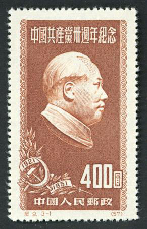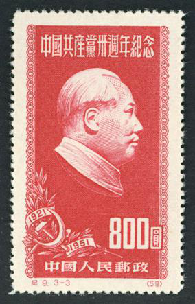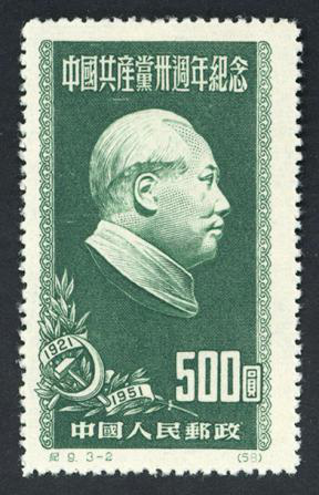 1951年7月1日,中國郵政發(fā)行《中國共產(chǎn)黨三十周年紀(jì)念》紀(jì)念郵票,一套3枚。郵票圖案相同,均為毛主席側(cè)面浮雕像。顏色不同,分別為赭石色、深綠色、紅色。畫面采用深色襯底,通過色彩的鮮明對(duì)比,突出了浮雕凸起的質(zhì)感。左下角裝飾著橄欖葉和黨旗標(biāo)志——鐵錘和鐮刀相交叉組成的圖案,左右邊框鑲著富有中華民族特點(diǎn)和吉祥寓意的如意花紋,并標(biāo)明“1921-1951”年份,象征著以毛澤東同志為主要代表的中國共產(chǎn)黨在30年的艱難歷程中,領(lǐng)導(dǎo)中國人民進(jìn)行了新民主主義革命,終于推翻了帝國主義、封建主義和官僚資本主義的統(tǒng)治,建立了以工人階級(jí)領(lǐng)導(dǎo)的以工農(nóng)聯(lián)盟為基礎(chǔ)的人民民主專政的國家,并繼續(xù)領(lǐng)導(dǎo)全國人民開始進(jìn)行社會(huì)主義革命和建設(shè)。