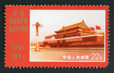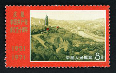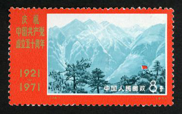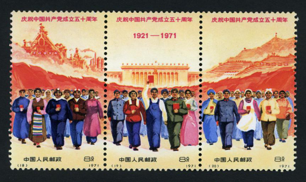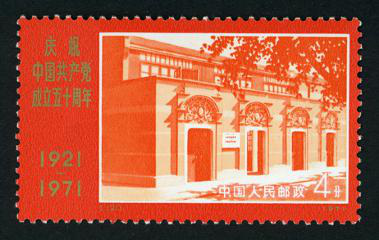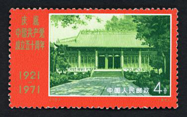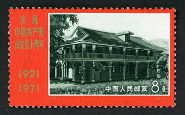 1971年7月1日,為紀(jì)念中國(guó)共產(chǎn)黨成立五十周年,中國(guó)郵政發(fā)行《慶祝中國(guó)共產(chǎn)黨成立五十周年》紀(jì)念郵票,一套9枚。整套郵票中,革命紀(jì)念地郵票6枚,分別是中國(guó)共產(chǎn)黨第一次全國(guó)代表大會(huì)會(huì)址(上海)、廣州農(nóng)民運(yùn)動(dòng)講習(xí)所、革命搖籃井岡山、遵義會(huì)議會(huì)址、革命圣地延安、首都天安門(mén)。其余3枚以連票形式表現(xiàn)了全國(guó)各族人民在黨的指引下奮勇前進(jìn)。