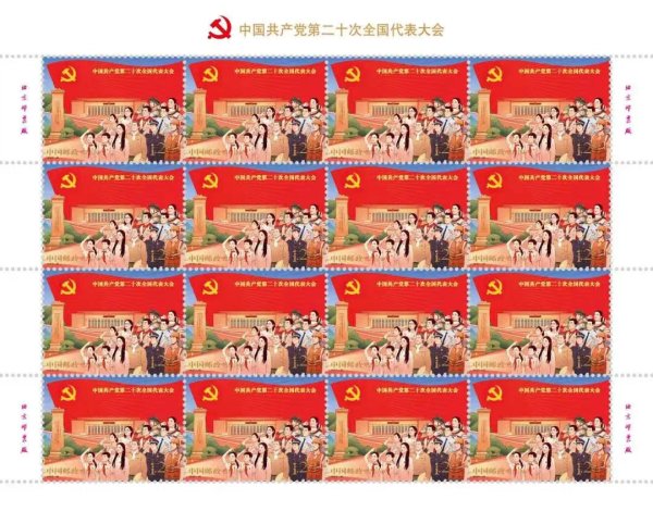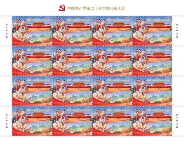 中國(guó)郵政定于2022年10月16日發(fā)行《中國(guó)共產(chǎn)黨第二十次全國(guó)代表大會(huì)》紀(jì)念郵票一套2枚,小型張1枚。郵票第一圖名稱為“奮進(jìn)新征程”,第二圖名稱為“建功新時(shí)代”,小型張圖案名稱為“慶祝中國(guó)共產(chǎn)黨第二十次全國(guó)代表大會(huì)勝利召開”。全套郵票面值8.40元。郵票計(jì)劃發(fā)行數(shù)量為1390萬套,小型張計(jì)劃發(fā)行數(shù)量790萬枚。
