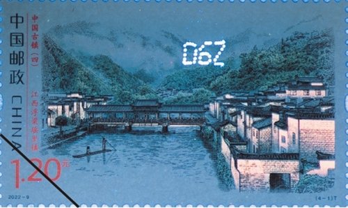 制版防偽的夢(mèng)幻聯(lián)動(dòng)。通過(guò)制作難以復(fù)制的印版,達(dá)到防偽印刷的目的,是郵票防偽的重要手段。2022年,北京郵票廠的制版技術(shù)特點(diǎn)在多套郵票上得到了充分發(fā)揮?!吨袊?guó)現(xiàn)代科學(xué)家(九)》紀(jì)念郵票采用縮微文字防偽技術(shù),在放大鏡下可觀察到由人名縮寫組成的連接科學(xué)家生辰的橫線,如“劉東生(LDS)”“袁隆平(YLP)”,字高僅0.18mm?!抖赐ズ沸⌒蛷埐捎冒加∽冾l隱藏圖案技術(shù),圖稿掃描后隱藏圖案不可見,實(shí)現(xiàn)了影寫版的防復(fù)制。隱藏圖案的效果在放大鏡下需仔細(xì)觀察,在“CHINA”字樣左下方,一只小帆船蕩漾在波光粼粼的湖面上,配合珠光藍(lán)特種油墨的使用,感受景與物的夢(mèng)幻聯(lián)動(dòng)。