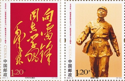 《毛澤東“向雷鋒同志學(xué)習(xí)”題詞發(fā)表六十周年》紀(jì)念郵票一套2枚,圖案名稱分別為“毛澤東同志題詞”“《雷鋒》雕塑”