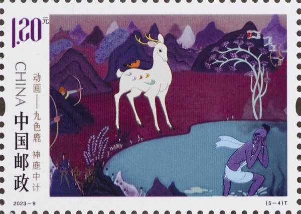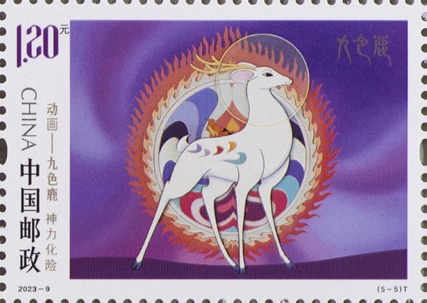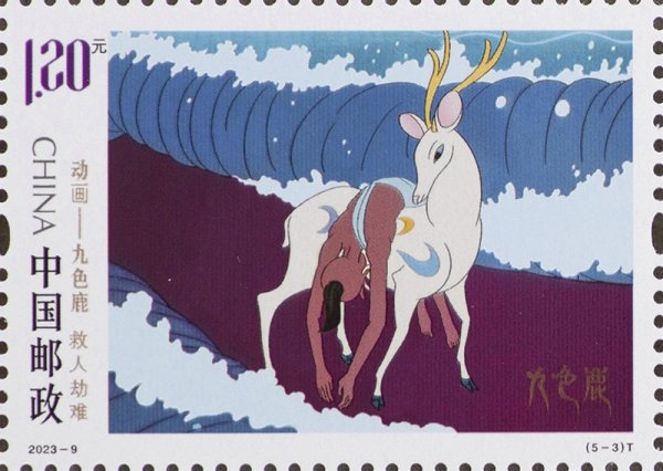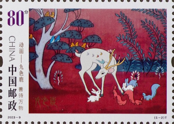 2023年6月1日,中國郵政發(fā)行《動畫——九色鹿》特種郵票1套5枚,郵票圖案名稱為神鹿現(xiàn)身、善待萬物、救人劫難、神鹿中計、神力化險。全套郵票面值5.20元。郵票計劃發(fā)行數(shù)量為620萬套。