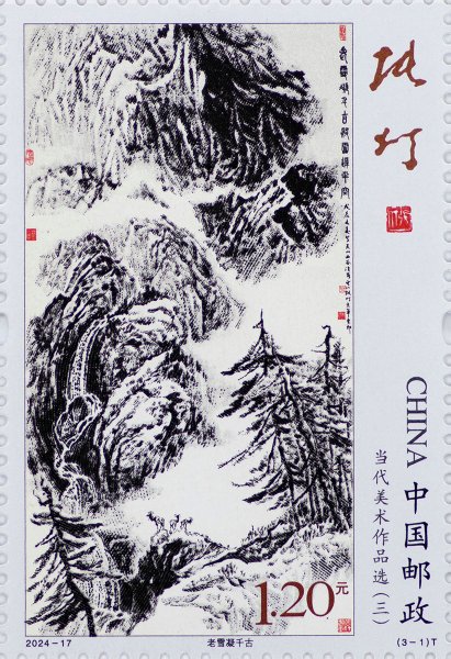 中國郵政定于2024年8月9日發(fā)行《當代美術(shù)作品選(三)》特種郵票1套3枚,郵票圖案名稱為老雪凝千古、白云黃鶴、我的祖國·我的人民。全套郵票面值3.60元。郵票計劃發(fā)行數(shù)量為620萬套。
