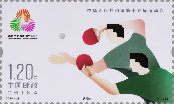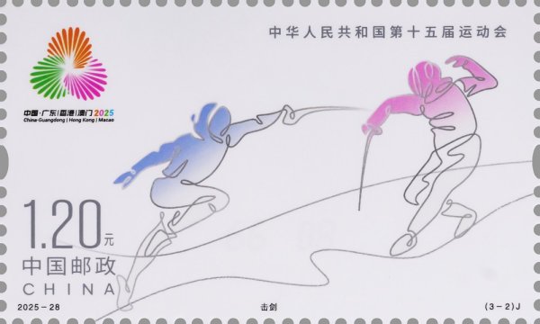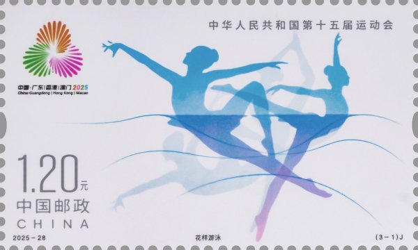 中國郵政定于2025年11月9日發(fā)行《中華人民共和國第十五屆運動會》紀(jì)念郵票1套3枚,郵票圖案名稱為:花樣游泳、擊劍、乒乓球。全套郵票面值3.60元,計劃發(fā)行數(shù)量為套票500萬套,版式二69.3萬版。