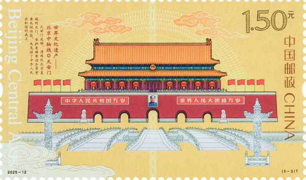 中國郵政定于2025年7月27日發(fā)行《世界文化遺產(chǎn)——北京中軸線》特種郵票1套5枚。郵票圖案名稱為:永定門、正陽門、天安門、故宮·景山、鐘鼓樓。全套郵票面值5.50元。郵票計(jì)劃發(fā)行數(shù)量為套票570萬套,版式二69.3萬版。