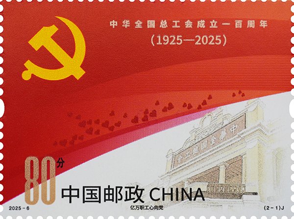 中國郵政定于2025年5月1日發(fā)行《中華全國總工會(huì)成立一百周年》紀(jì)念郵票1套2枚,郵票圖案名稱為:億萬職工心向黨、團(tuán)結(jié)奮斗新征程。全套郵票面值2.00元,計(jì)劃發(fā)行數(shù)量570萬套。